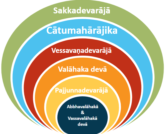 Generally speaking, Valāhakas fall under the domain of the Four Great Kings (Cātumahārājikā), specifically under the reign of Vessavaṇa12, king of the northern quarter and lord of Yakkhas13 (DN 20). Pajjuna is a cloud deva with kingship over storm and rain cloud devas14. Sakka15 has direct authority over the Four Great Kings, as well as all subordinate celestial beings16.